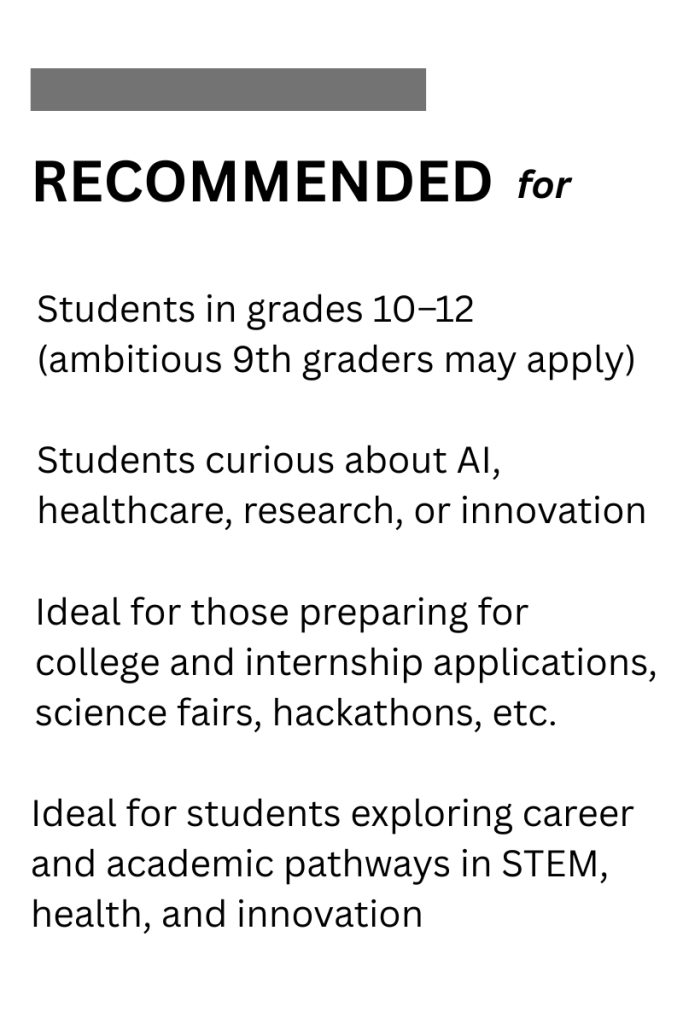 Whether your student is interested in medicine, engineering, research, or entrepreneurship, or is still undecided about a career pathway, this program will provide them clarity. The curriculum equips them with the research skills, creative problem-solving skills, an innovation mindset, and the necessary foundational AI skills (if they pick the AI track). Students graduate with a polished prototype, a personal portfolio, and the confidence to pursue bold ideas, all of which are required to stand out in college applications, science fairs, and future internships.