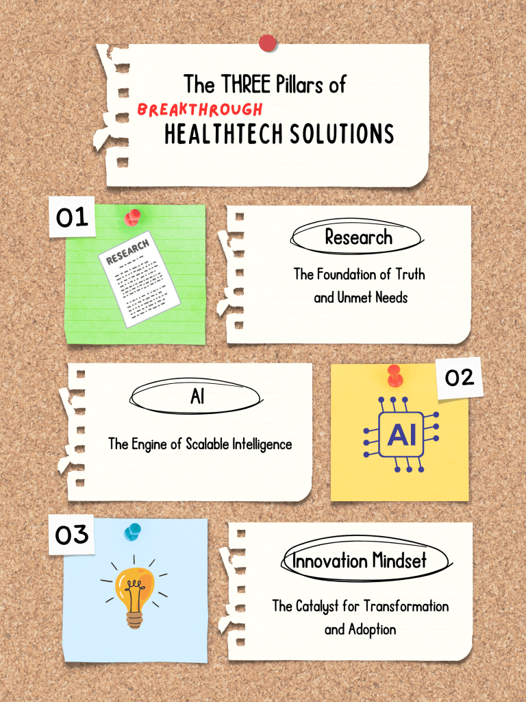 Without any one of these pillars, a HealthTech solution would either be irrelevant, incapable of processing its own data, or unable to make a real-world difference.
